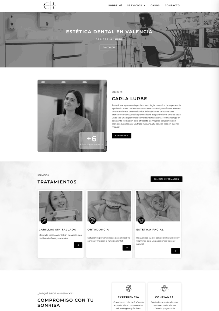 Se diseñó una estructura clara con secciones como Sobre mí, Servicios, Casos y Contacto, cuidando que la navegación fuera intuitiva y que cada tratamiento se presentara de forma clara y confiable.
