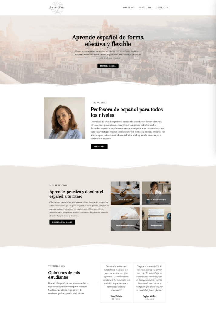 La página web fue desarrollada desde cero con el objetivo de reflejar la identidad profesional de Josune Kutz, profesora de español y especialista en comunicación intercultural.