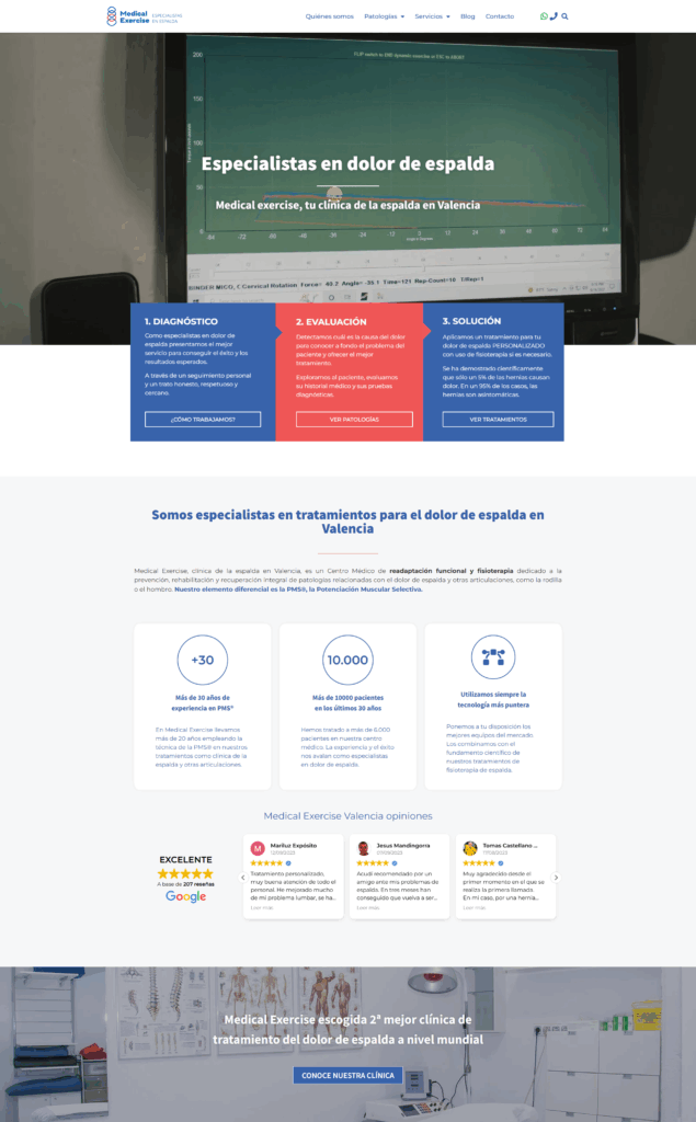 Cuando comenzamos a trabajar con Medical Exercise, nuestro primer paso fue conocer a fondo su clínica, sus servicios especializados en dolor de espalda y articulaciones, su metodología PMS® y el perfil de sus pacientes. Queríamos entender cómo transmitir profesionalidad, confianza y tecnología avanzada a través de su presencia digital.
