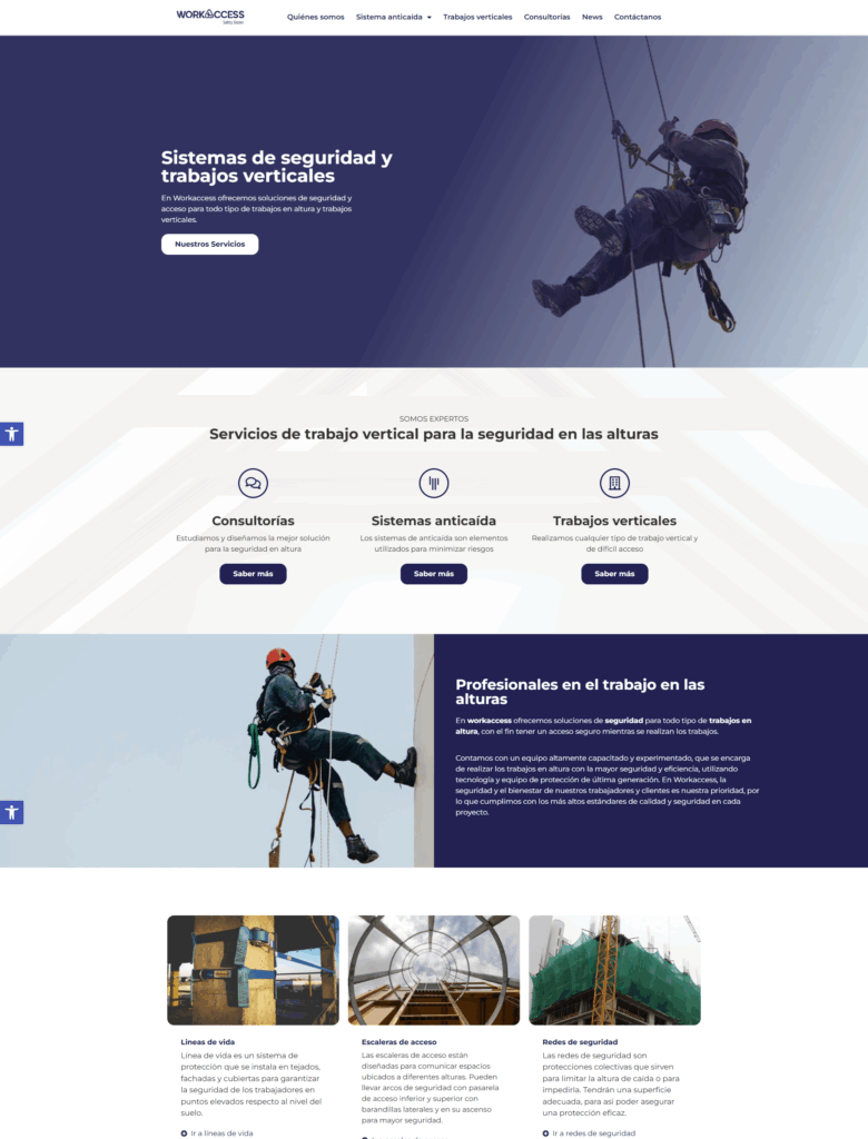 Con esta información, diseñamos una estrategia digital orientada a incrementar la visibilidad online de Workaccess. La página web debía convertirse en una herramienta capaz de atraer visitantes, al mismo tiempo que transmitiera la experiencia, profesionalidad y compromiso con la seguridad que caracteriza a sus servicios en instalaciones anticaídas, trabajos en lugares de difícil acceso y soluciones personalizadas.